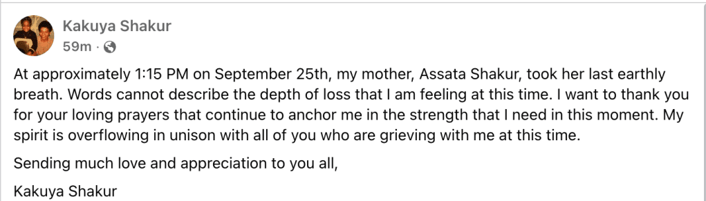 “At approximately 1:15 PM on September 25th, my mother, Assata Shakur, took her last earthly breath. Words cannot describe the depth of loss that I am feeling at this time. I want to thank you for your loving prayers that continue to anchor me in the strength that I need in this moment. My spirit is overflowing in unison with all of you who are grieving with me at this time,” expressed Kakuya in a Facebook post.