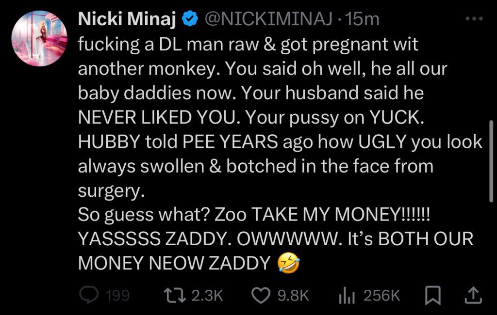 In a lengthy X post, the Grammy-winning rapper called Minaj a “pathetic loser a** demonic insane bi**h” and suggested that she seek therapy.