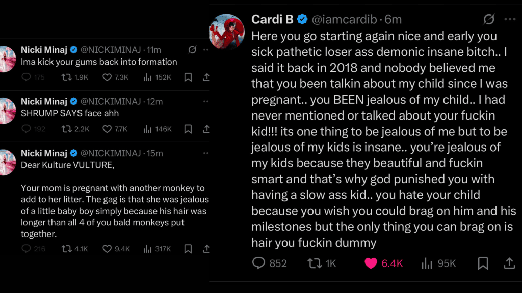 In one of Minaj’s X posts on Wednesday (Oct. 1), she insinuated that she would “kick” Cardi’s daughter Kulture‘s “gums back into formation,” and after that, all bets were off.