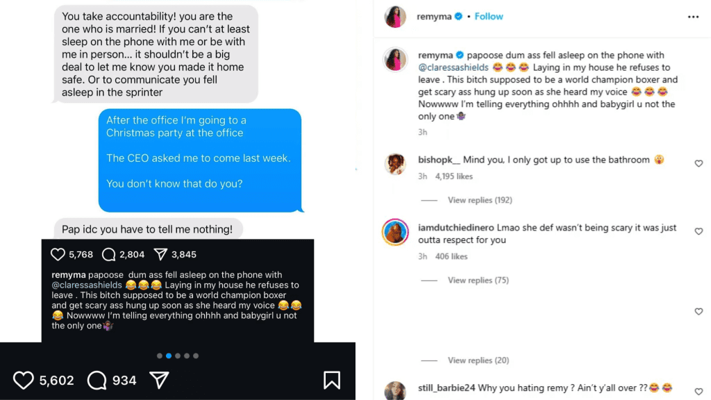 Remy captioning the thread: “Papoose dumb a** fell asleep on the phone with @claressashields [laughing emojis] Laying in my house he refuses to leave. This bi**h supposed to be a world champion boxer and her scary a** hung up as soon as she heard my voice [laughing emojis]. Now I’m telling everything! Oh, and babygirl, you’re not the only one [shrug emoji].”