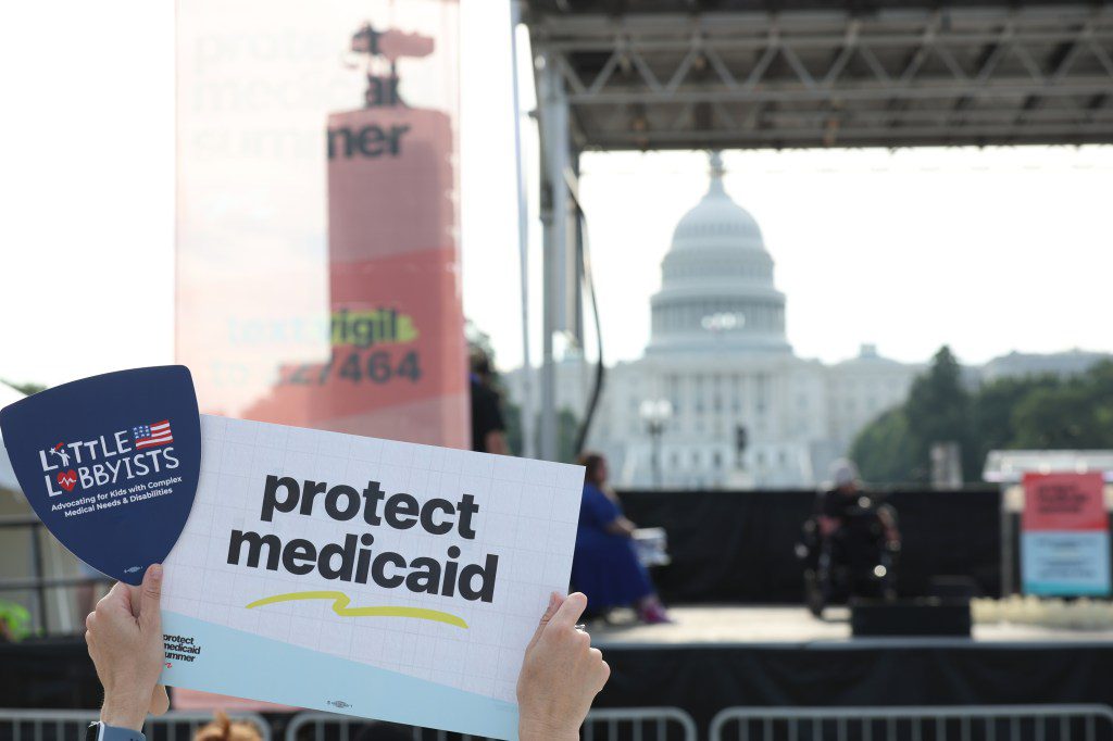 General view of signage as 60-Hour Medicaid Vigil Ends with Promise: “We Won’t Get Over This Betrayal – We’re Getting Organized” on July 26, 2025 in Washington, DC.