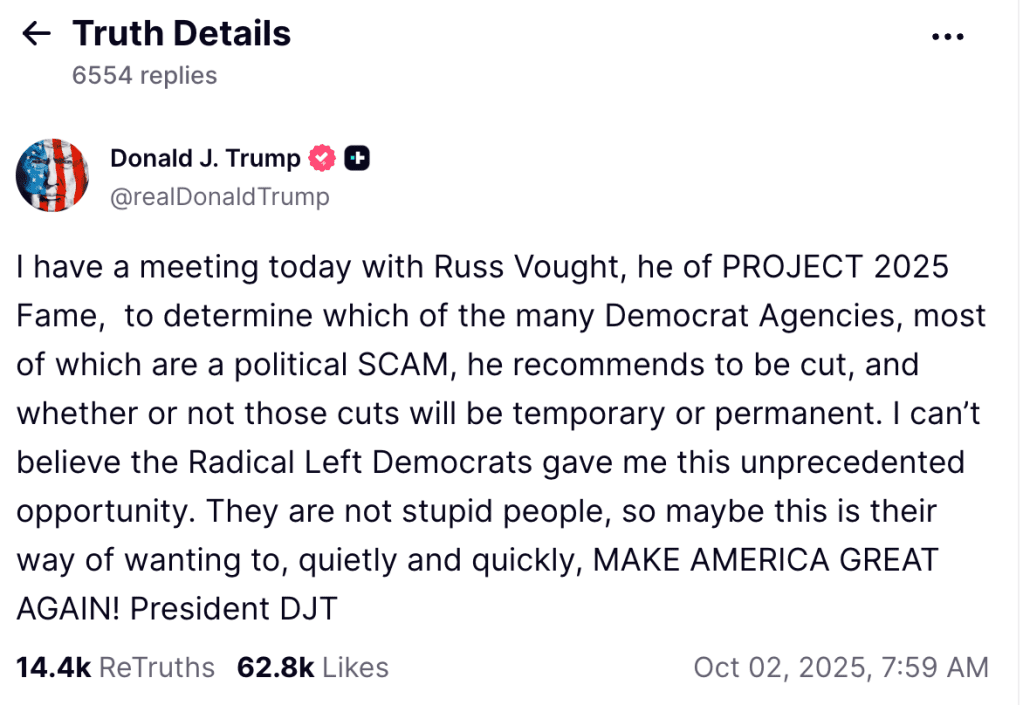 President Donald Trump framed the shutdown as an opportunity to make further government cuts. “We’ll be laying off a lot of people,” he said on last week (Sept. 30), the day before the shutdown began. He also posted on Truth Social, “I have a meeting today with Russ Vought, he of PROJECT 2025 Fame, to determine which of the many Democrat Agencies, most of which are a political SCAM, he recommends to be cut, and whether or not those cuts will be temporary or permanent.”